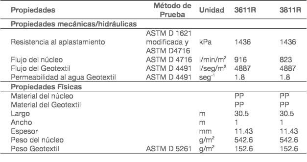 Tabla de propiedades de los Geodrenes de Alto Desempeño